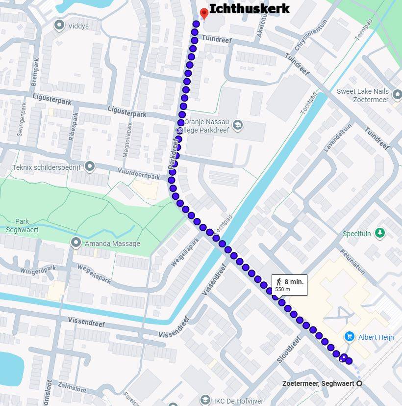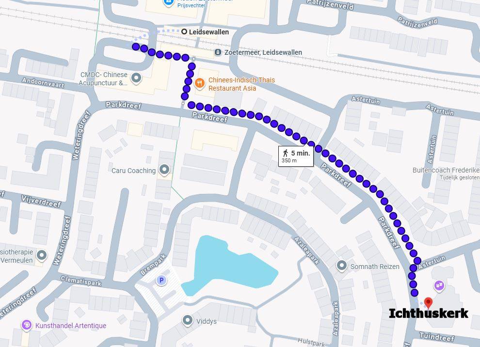 E-Mail Hierboven de wandelroutes van Randstadrail Seghwaert of Randstadrail Leidsewallen naar de Ichthuskerk. Klik op de plaatjes om een grotere plattegrond te zien.